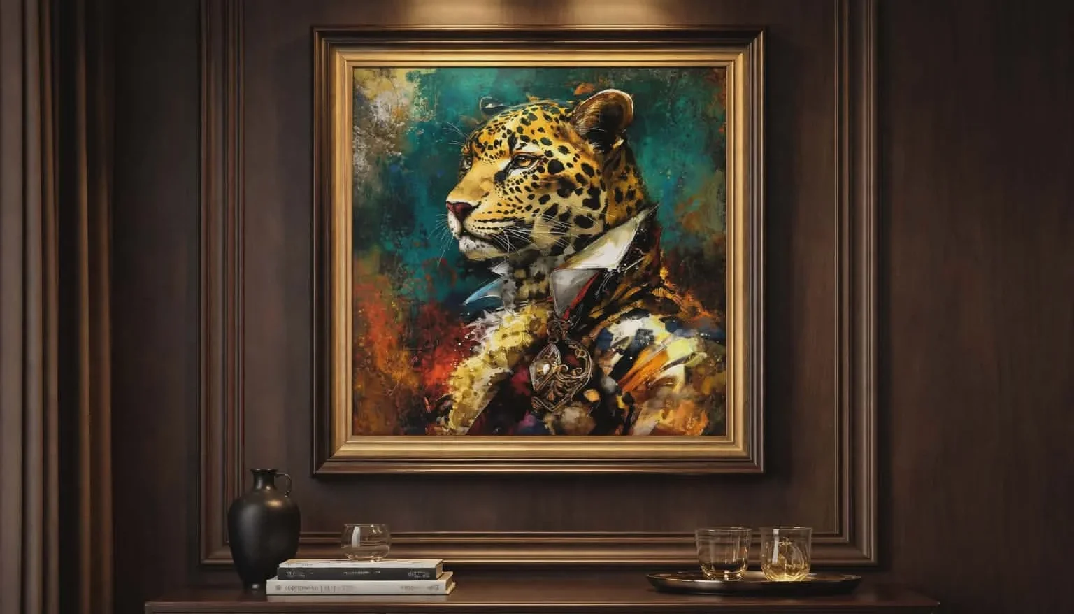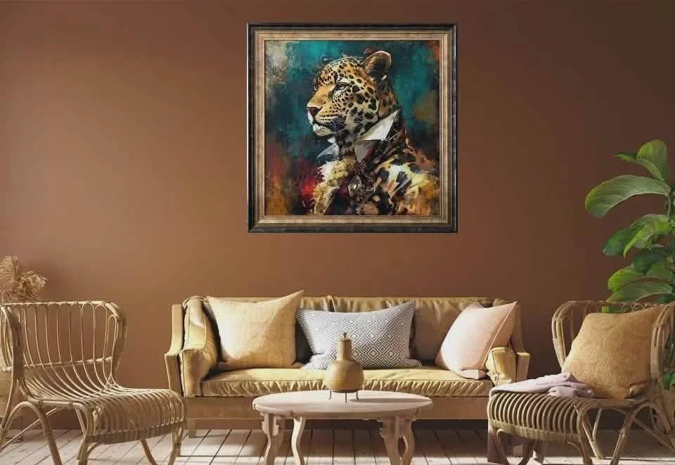 Σύγχρονος διακοσμητικός πίνακας σε κορνίζα, που απεικονίζει με μοναδική λεπτομέρεια και κομψότητα το πορτρέτο ενός επιβλητικού και αριστοκρατικού λεοπάρδαλου. Οι