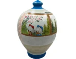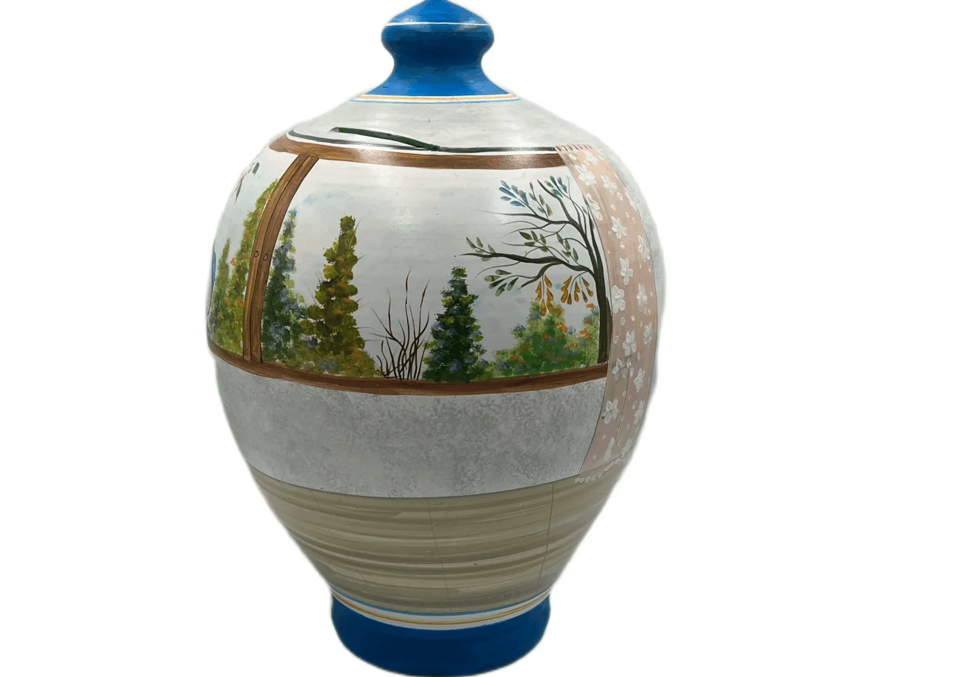 • Διακόσμηση: Η επιφάνειά του είναι διακοσμημένη με ζωηρές, πολύχρωμες ζωγραφιές. Το φόντο είναι ένα φυσικό τοπίο με γήινους τόνους. Περιλαμβάνει δέντρα με γυμνά κλαδιά, καθώς και θάμνους και γρασίδι σε διάφορες αποχρώσεις του πράσινου και του κίτρινου. Ο ουρανός έχει έναν απαλό, γαλάζιο τόνο με σύννεφα.