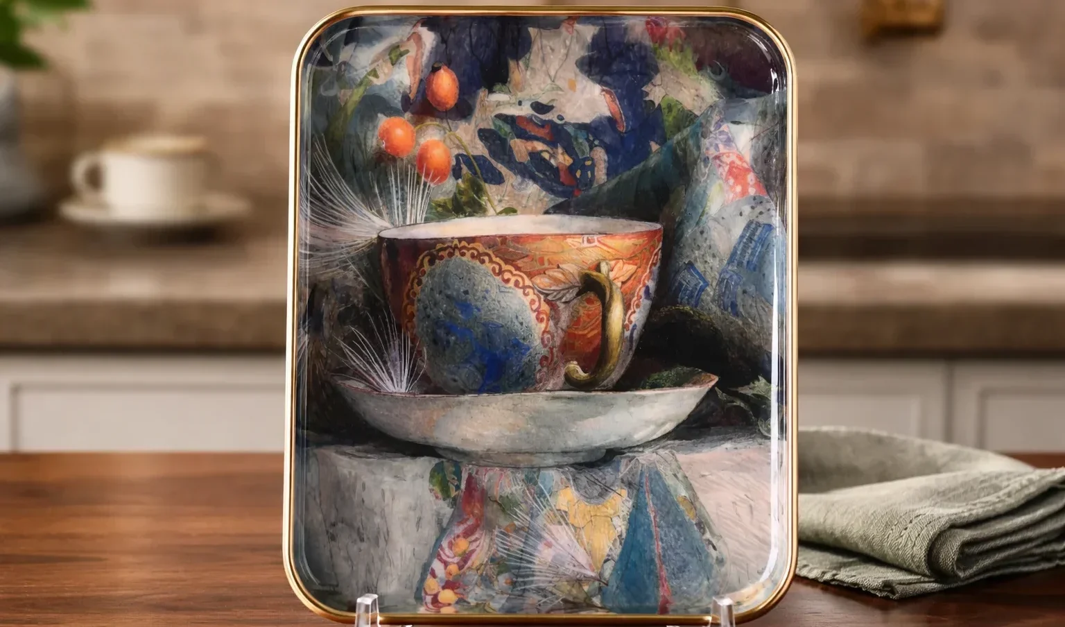 Όμορφη μεταλλική πιατέλα με ιδιαίτερο σχέδιο που απεικονίζει ένα φλιτζάνι πάνω σε πιατάκι. Τα χρώματα είναι ζωντανά και συνδυάζουν μπλε, κόκκινο και πράσινο, δίνοντας μια καλλιτεχνική και μοντέρνα εμφάνιση. Έχει ορθογώνιο σχήμα με στρογγυλεμένες γωνίες και λεπτό χρυσό τελείωμα που την κάνει πιο κομψή. Ιδανική για σερβίρισμα, αλλά και για διακόσμηση στο σπίτι ή την κουζίνα.