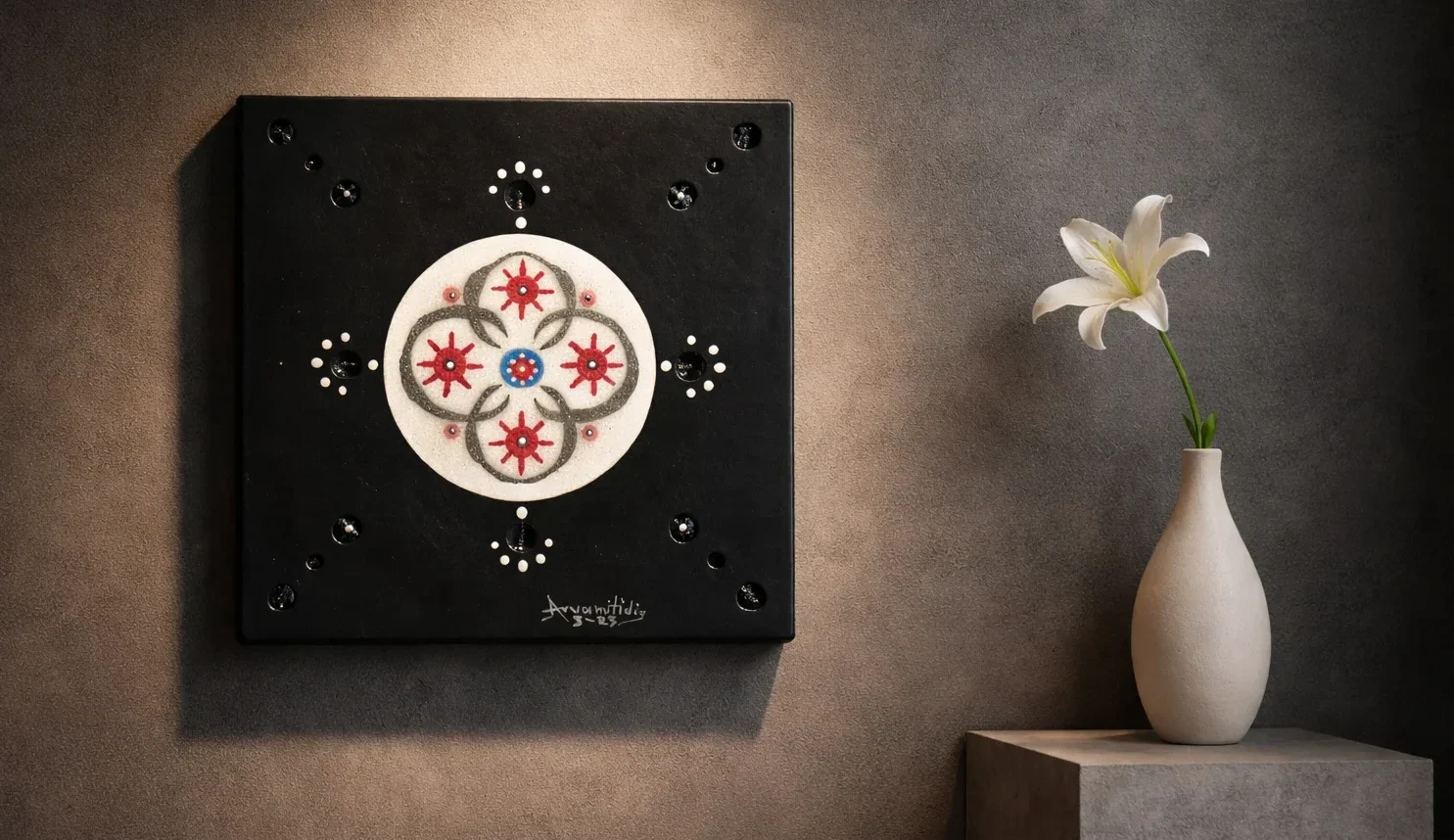 Έργο του καλλιτέχνη Νίκου Αρβανιτίδη, φιλοτεχνημένο σε ξύλινη επιφάνεια. Η σύνθεση χαρακτηρίζεται από έναν κεντρικό κυκλικό σχηματισμό με διακοσμητικά μοτίβα σε κόκκινο, μαύρο και μπλε χρώμα. Το φόντο είναι έντονα μαύρο, με διάσπαρτες λευκές κουκκίδες και ανάγλυφα στοιχεία που ενισχύουν την τρισδιάστατη αίσθηση.